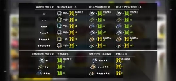 2.黄票获取方式 黄票可以通过第一次获得干员,或重复获得5★/6★稀有干员,此外也可以通过兑换4★/5★/6★干员信物获取,详见下图。