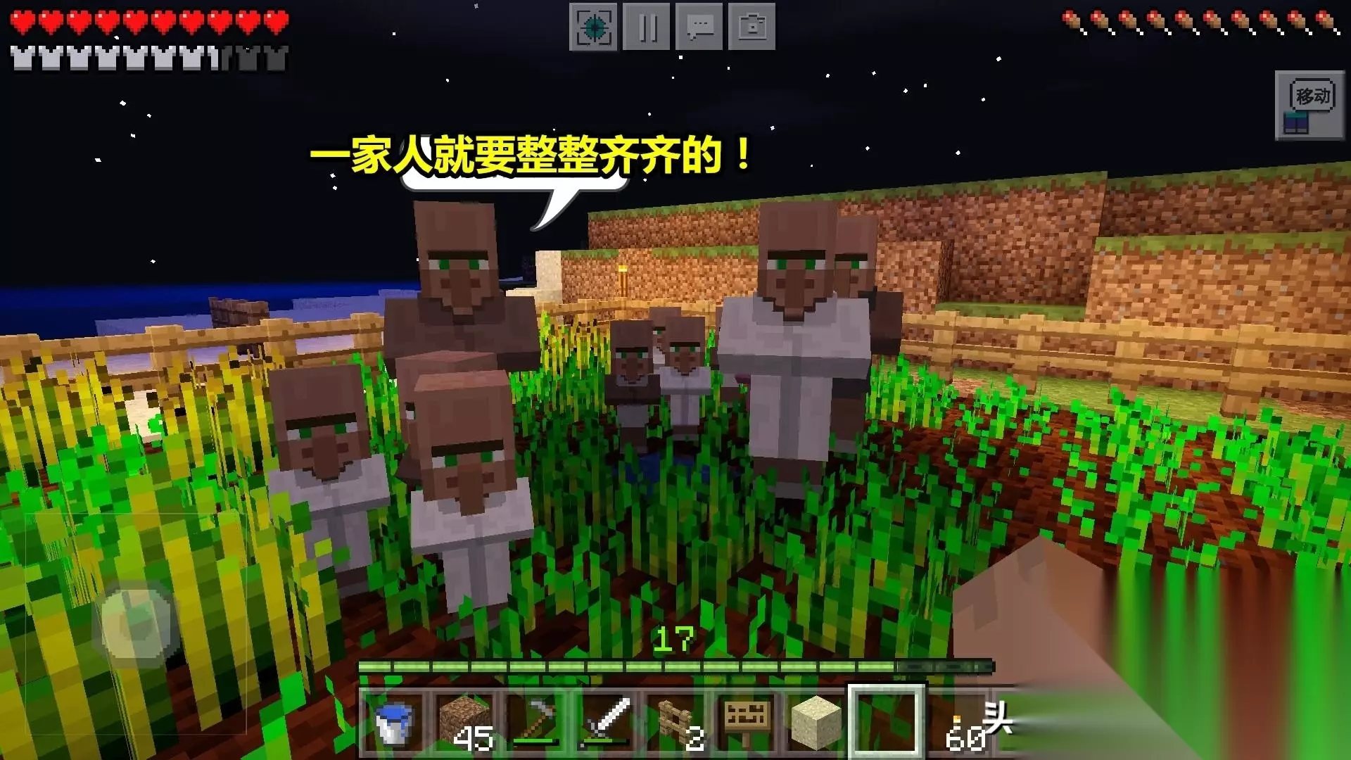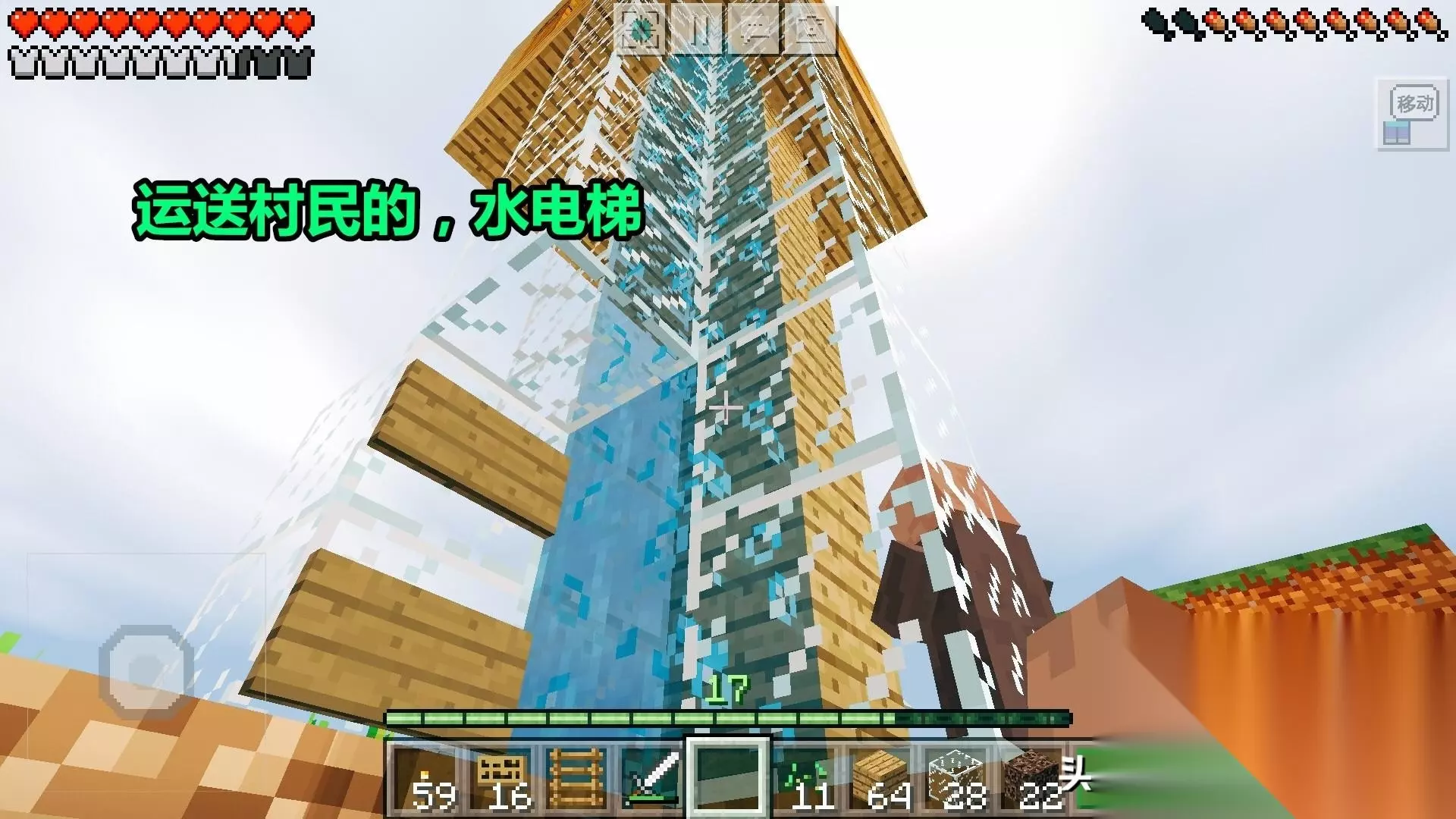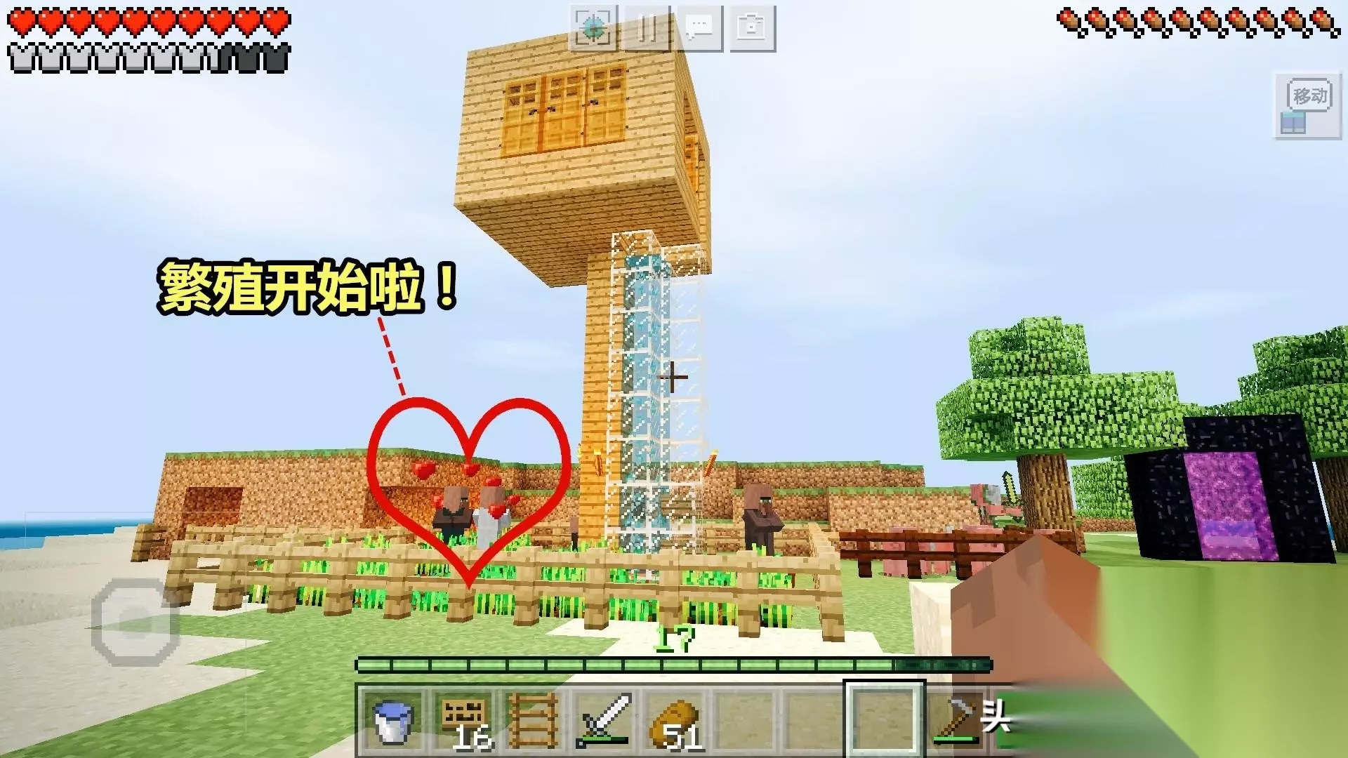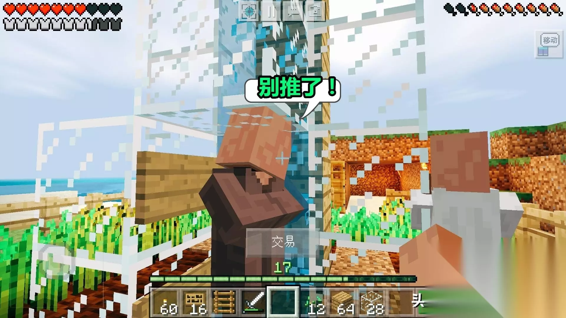第6步:推村民上去!把村民推进水电梯,他就能直接到上方的房间里了。(看到没,我推的居然是农民。后来才发现的,结果又重新换了个铁匠村民上去。因为农民要在下面种地和繁殖的)