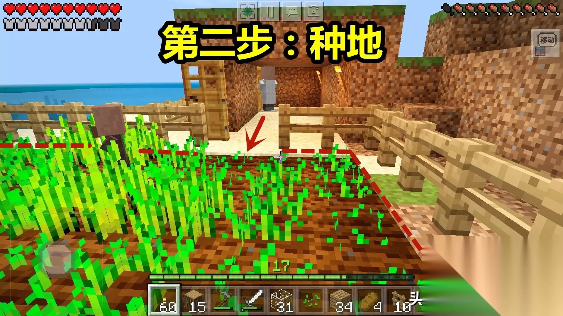 第2步:种地;9*9的农田足矣,地上种小麦、胡萝卜、马铃薯都可以。然后把三只村民放进来,等小农民长大了,就可以自己种地啦。 二:开始建造“繁殖工程”