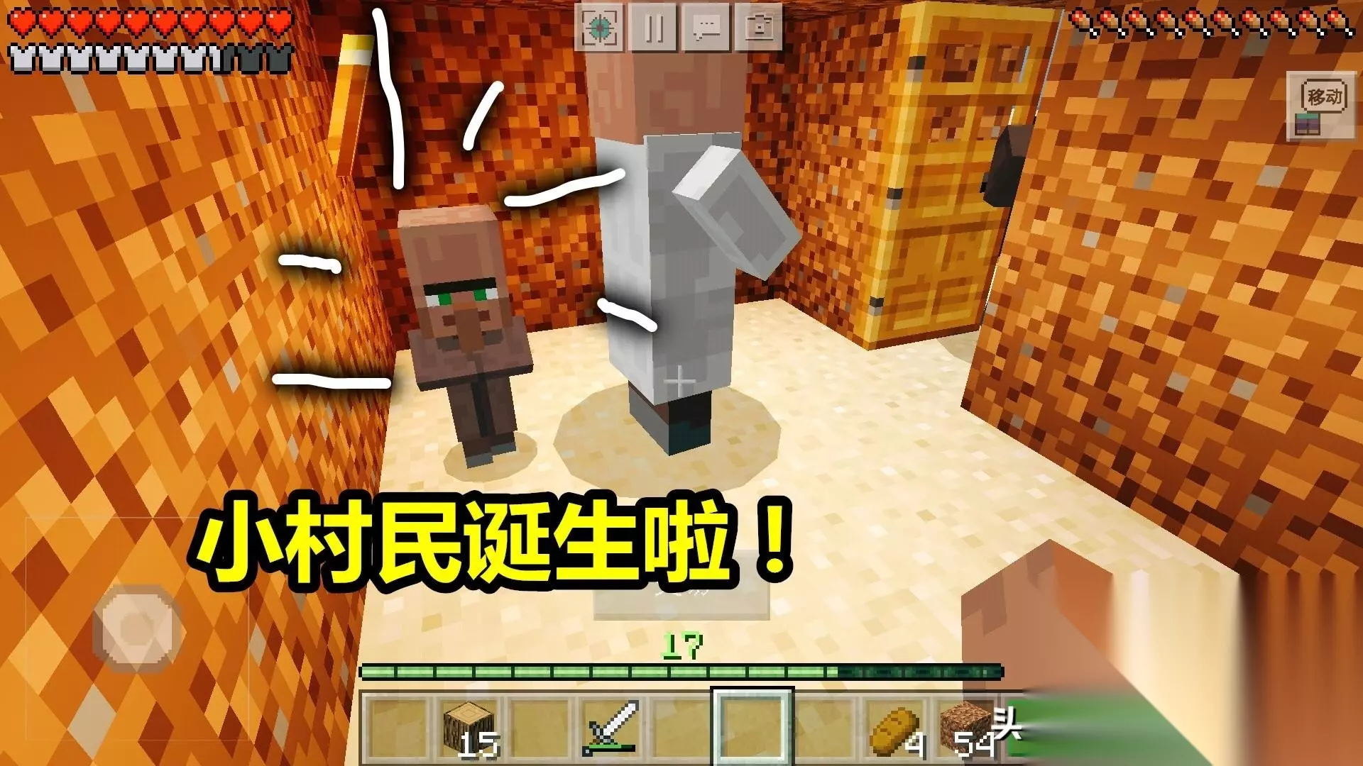 第1步:生孩子;如果想让《我的世界》村民繁殖,需要具备两个条件:1.有效门;2.村民有意愿繁殖。有效门如果不懂,你就模仿村庄的房间造。而让村民有意愿繁殖一般来说有两个方法;食物:给村民扔面包、胡萝卜、马铃薯这类食物,所谓饭饱思那啥,就是这个道理;交易:同村民交易,也会使其进入繁殖模式;我的运气不错,生出了一只小农民出来(棕色村民都是农民);