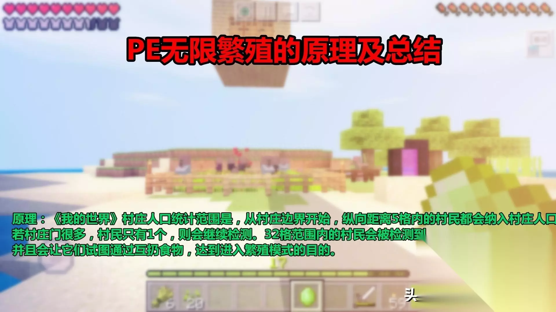 原理:《我的世界》村庄人口统计范围是,从村庄边界开始,纵向距离5格内的村民都会纳入村庄人口。若村庄门很多,村民只有1个,则会继续检测。32格范围内的村民会被检测到,并且会让它们试图通过互扔食物,达到进入繁殖模式的目的。农民:作用是用来种地,收作物,制作面包,互扔食物。以达到进入繁殖模式的目的; 总结:目前来说,PE版Minecraft村民繁殖数量会受到限制。但若村民被运送走,则这里会迅速繁殖村民,直至数量上限。所以村民理论上做到了无限繁殖,且还省去了JAVA版中制作关闭无限繁殖的装置。目前装置还只是个雏形,后期继续探索和优化。