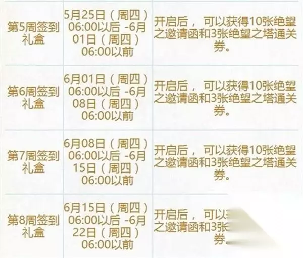 更加惊喜的是 每周奔跑从第五周开始送绝望之塔的通关券,又可以让你把那些不好打的关卡通过。这样的话,达到100层也是没有问题的!