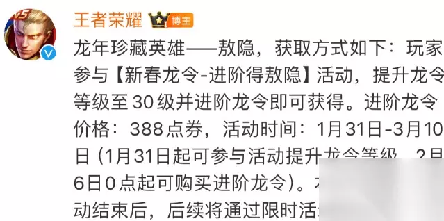 王者荣耀敖隐怎么获得 新英雄敖隐2月6上线 获取方法: 提升龙令至30级,需要388点券进阶 后续通过限时活动获取 官方公告: 龙年珍藏英雄——敖隐,获取方式如下:玩家参与【新春龙令-进阶得敖隐】活动,提升龙令等级至30级并进阶龙令即可获得。 本次新春龙令活动结束后,后续将通过限时活动获得。