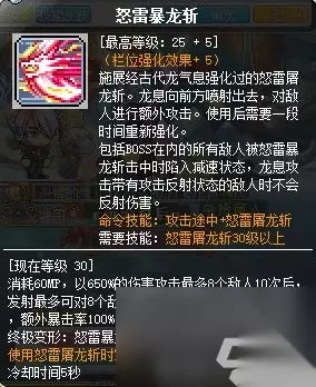 还有一种加点是如果为了蓄变形值,可以考虑将恶魔之息-暴怒坚持、恶魔之息-强化都替换为扇击-坚持、扇击-额外攻击。 4、超级属性选择: 普通玩家可以考虑优先选择均点加暴击伤害、暴击率、伤害、首领怪伤害、无视防御。由于狂龙战士没有变身的情况下,稳如泰山并非100%,前期狂龙战士玩家对这块介意,也可以考虑部分加点分配给稳如泰山,后期格兰蒂斯女神的祝福技能可以提供100%的稳如泰山。前期如果神秘不够的话,可能做无名村任务有点难受,可以考虑加几点神秘,打怪没那么吃力。后续由于超级属性点可以重置,因此后续可以根据实际情况,自己调整需要的属性。 5、V矩阵技能选择: 狂龙战士V矩阵核心搭配一般有两种,1种是2个三合一满3个技能强化,即:恶魔之息、剑气突袭、怒雷屠龙斩: