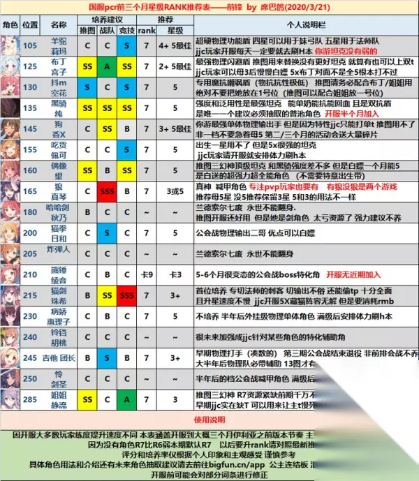 外号:狼 单体减甲物理辅助手 UB 对眼前目标造成物理伤害,并降低目标防御 skill1 对眼前目标造成伤害 skill2 降低眼前目标防御 EX skill 增加自己物理攻击 行动模式 开场 skill2→skill1 loop 普攻→普攻→skill2→普攻→skill1 评价 PVE 中→极高 Pvp 低 公会战 极高(必备) 最重要的物理减甲辅助手推荐初始必须带上,pve方面推图的时候怪的护甲不是很高可能会觉得狼没什么用。但是开服半个月在每个月活动副本中boss的护甲必须由狼减掉,不夸张的说没有狼你就需要付出别人两倍的资源去刷活动。公会战更不用说狼是必备的(想白嫖钻石抽老婆 狼是必须的) pvp方面配合单体物理角色可以组成物理蒸发队,针对单t或无嘲讽换t的阵容 备注:该角色装备方面很有讲究,请务必询问别人或者关注我看我的视频私聊我,得知狼需要卡多少rank,不小心按错会带来巨大不可逆的后果(不是危言耸听) 4、タマキ(珠希)