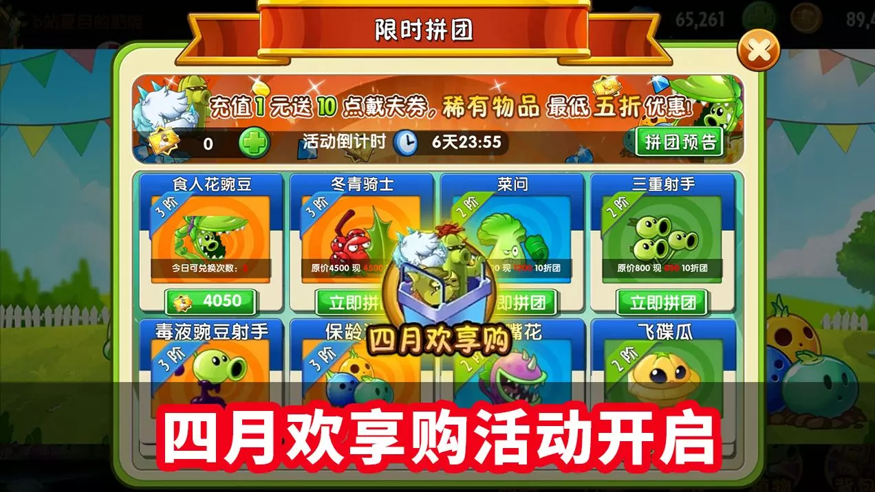 《植物大战僵尸》四月狂欢购第2天开启限时拼团活动,玩家花钻石参与拼团,活动结束后会按拼团人数对应的折扣返还钻石,最低可享5折。今日可拼团兑换毒液豌豆射手等植物,预告显示明日可拼团兑换3阶仙人掌等物品。