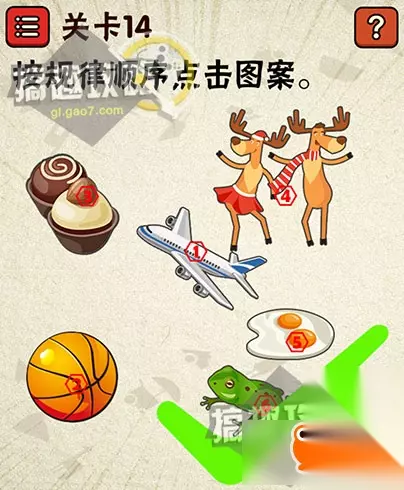 飞机1、蓝球2、蛋糕3、鹿4、荷包蛋5、青蛙6(根据首字母排列) 史上最囧游戏2第15关攻略: