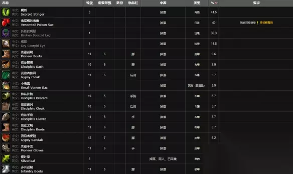 击杀掉落: 大概率掉落蝎刺,接受寻找解毒剂的任务后会掉落毒尾蝎的毒囊,小概率掉落5-10级的装备。