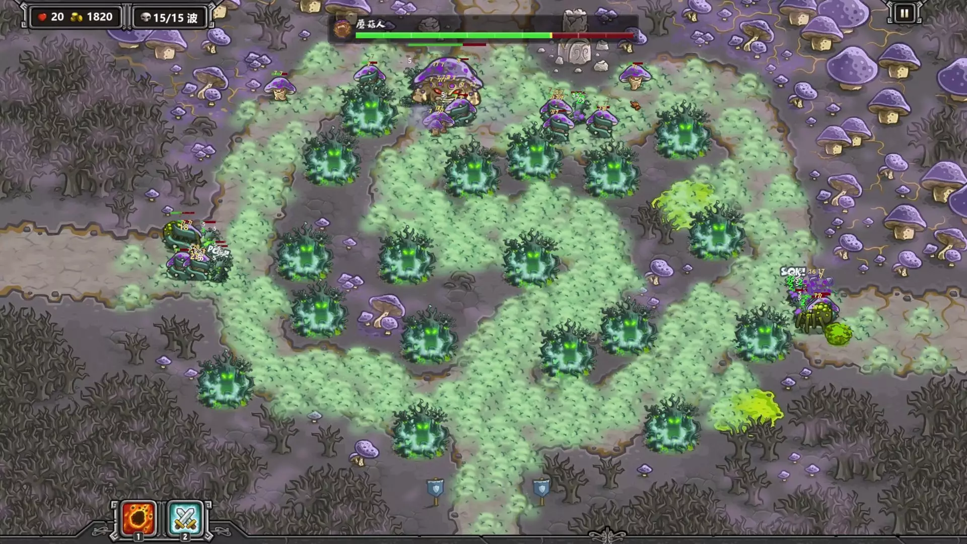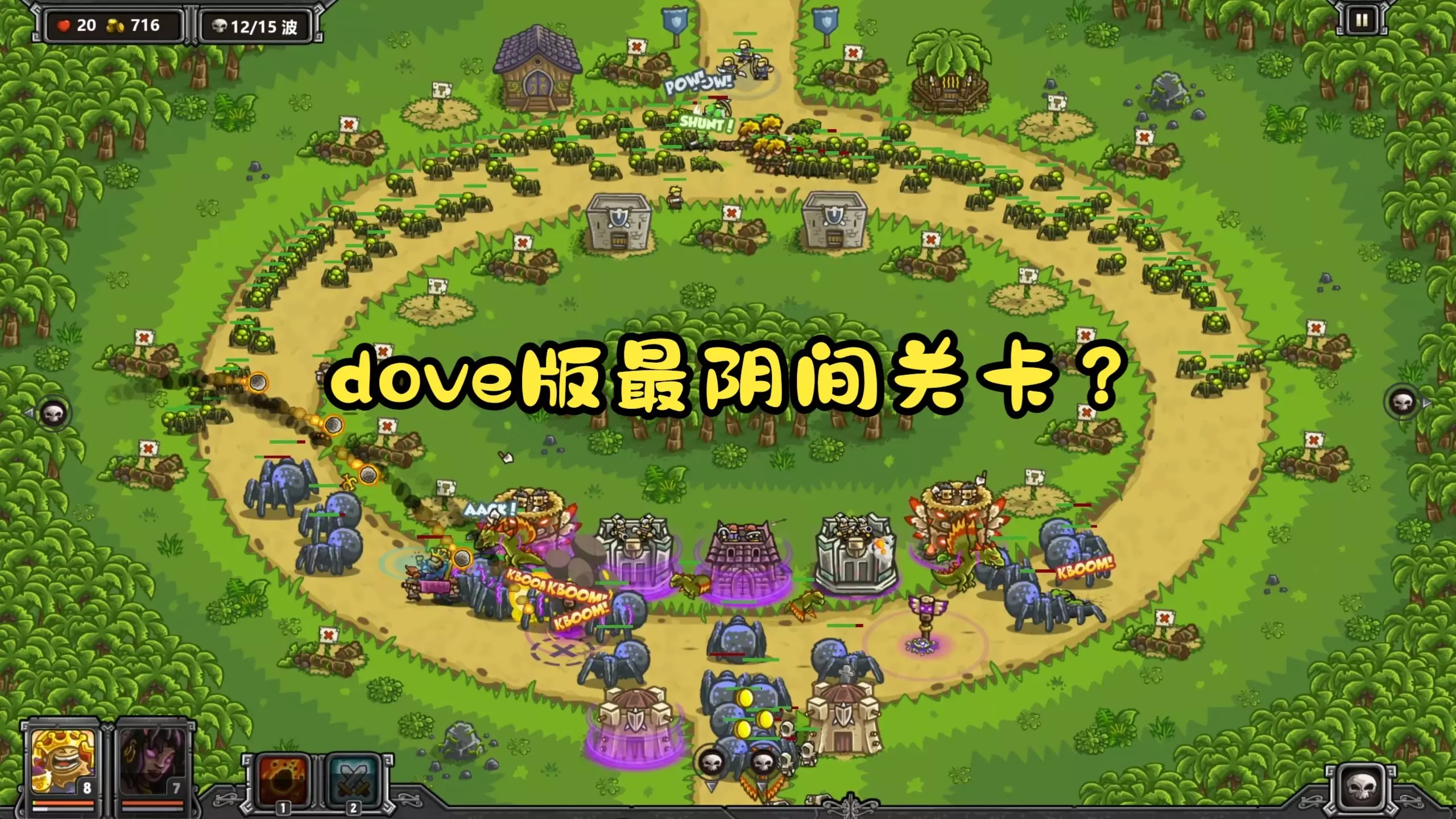 这是《王国保卫战》dove版的游戏内容,展示了林渊蛛巢关卡在不可能难度下的战役过程,采用不堵门的玩法,呈现了该关卡多波敌人进攻时的防御布局与战斗场景。