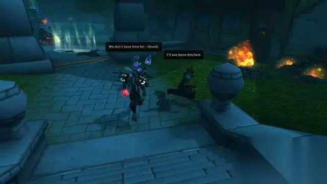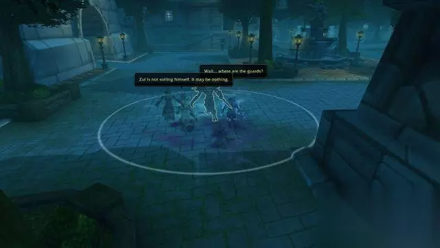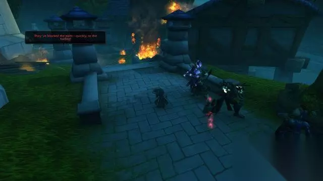 吉安娜·普罗德摩尔领主:投降吧,我会把你们带去监狱里。到时候便全凭国王处置。 纳萨诺斯·凋零者:无意冒犯,但我们有船要赶。 吉安娜·普罗德摩尔领主:那就死吧。 在吉安娜挥手之前,先知再一次说话了。 先知祖尔:能请你先等一等吗? 先知祖尔:我想,你一定不是没注意到吧,你的城市起火了。 先知祖尔:你可以干掉我们——区区几个部落的小卒。 先知祖尔:也可以回去扑灭火势。否则的话,我可以预言这场大火将把整个城市烧成白地。 先知祖尔:选择吧。 吉安娜与众人闻言回头一看,祖尔刚才种下的星星之火已经蔓延到了港口边的整座塔楼。