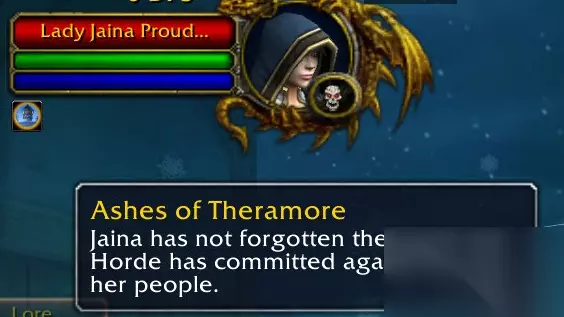 塞拉摩的灰烬 吉安娜还没有忘记部落对她和她的人民犯下的罪行。 (吉安娜并不会与你交战,也不会追击你。只是挡住了一侧的去路,迫使你去另一侧) 然而如果你尝试接近吉安娜,你会被立刻冰冻。