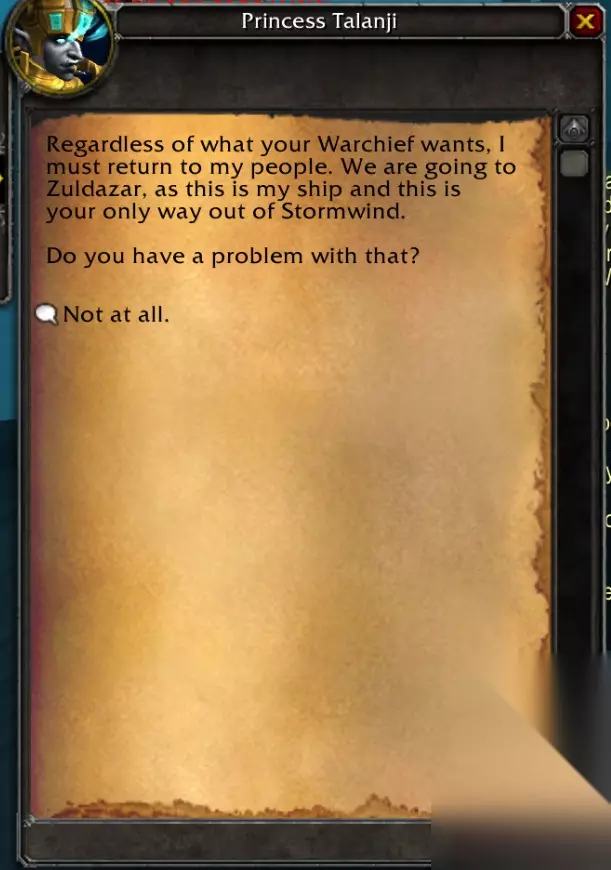 塔兰吉公主 不论你的大酋长有什么打算,我必须立刻回到我的同胞身边。我们现在就前往祖达萨。毕竟这是我的船,你也没别的办法逃离暴风城。 对此你有什么异议吗? (你只有这个选项) 再一次出现,你已经在赞达拉的首都:祖达萨了。