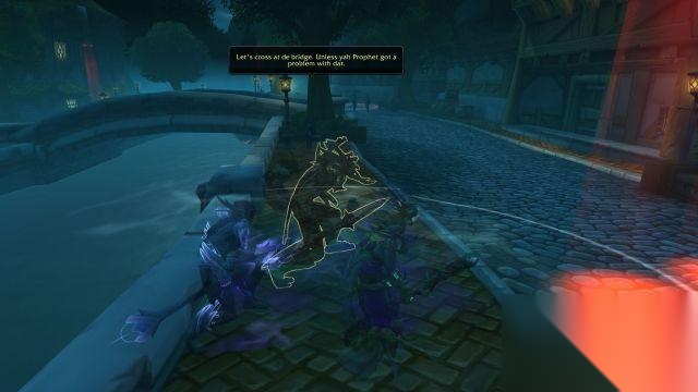 先知祖尔:啊呀呀呀。他们怎么可以把这么危险的东西随处乱丢呢?要是小朋友碰到可是会受伤的呀。 通往港口的道路已经被彻底封锁,看不出突破的希望,洛罕当即决定放弃这一逃跑路线。 洛罕:我们必须回到运河那里。再继续待在这我们会被轻易干掉的!跟上我。! 然而,祖尔又一次发言了。 先知祖尔:我们必须等在原地。 塔兰吉公主:这次又怎么了?