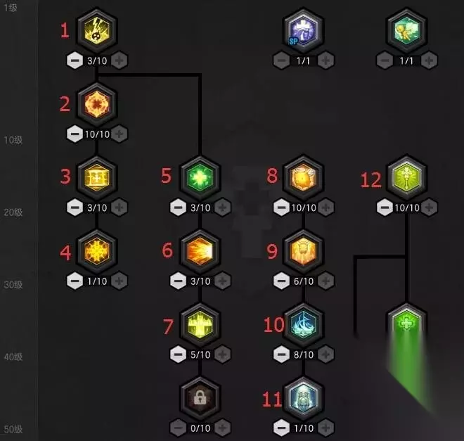 说明: 1、牧师攻击的起手技能为10技能,在10技能命中敌方后,快速位移到敌方身前释放4技能来僵直地方,同时释放7技能,并用2技能持续输出。 2、1技能如果可以的话,需要释放到地方身上,因为在1技能存在的情况下,2技能会造成额外102%的伤害。 3、8技能在安全距离时释放,给自己增加属性。同时7技能可以提前释放,一方面敌方路过7技能范围会对他造成伤害,从而逼迫敌方走位同时也可以给自身回血。 牧师推荐技能加点2: