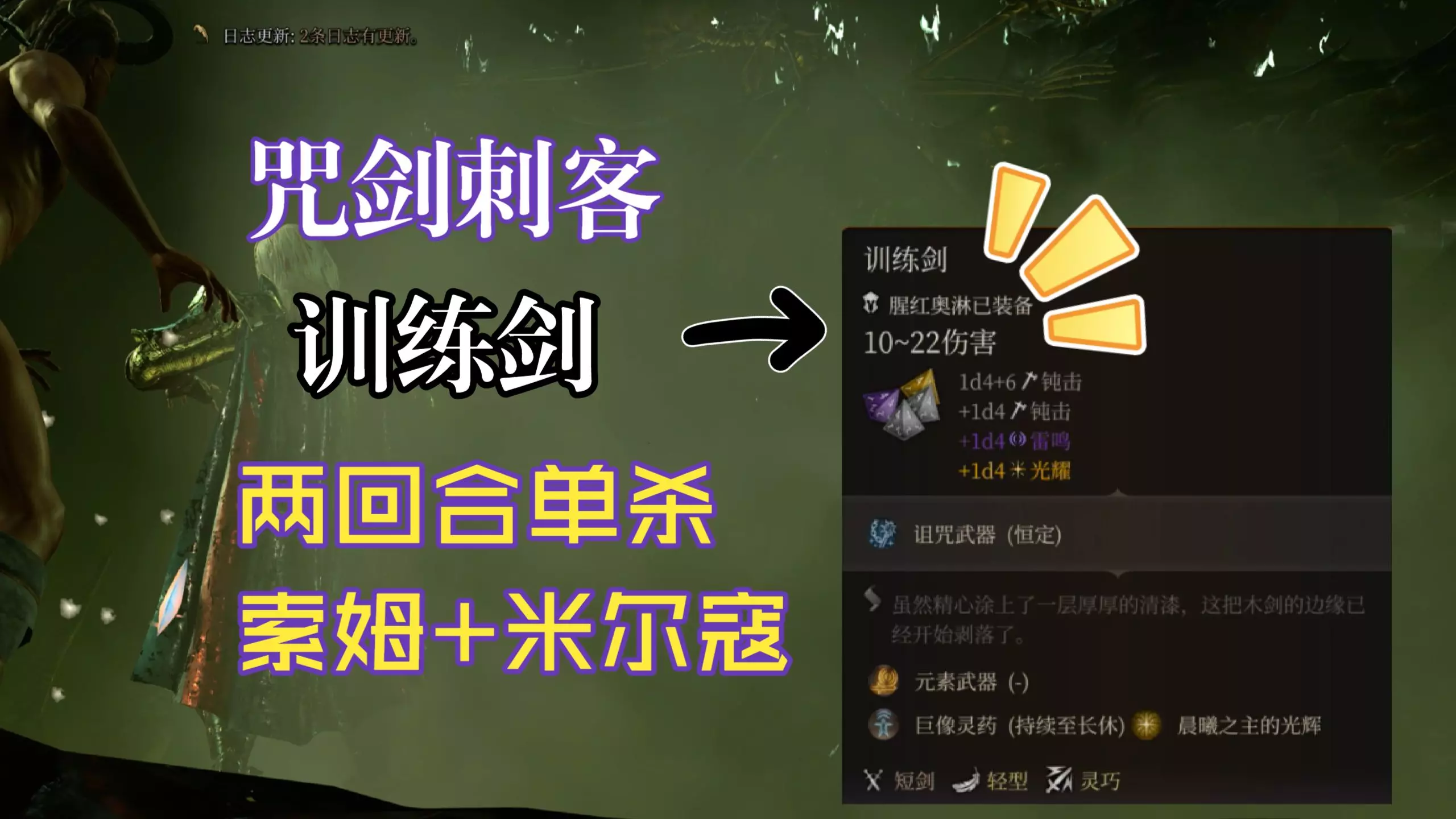 原理:训练剑是一把钝击+灵巧武器,可以触发刺客的偷袭,并且伤害类型是钝击。 重要!稀释锐利之油将训练剑变为魔法攻击,避免米尔寇的物抗。 炼金火焰上燃烧,水元素吃…
