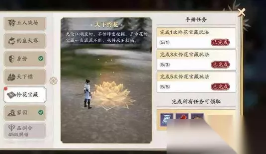 首先,怜花宝藏是一个组队玩法,需要5个人组队才可以参加,同时其开启时间为13:00到22:00。因此,小伙伴们想要参加怜花宝藏这个玩法,是一定要组齐5个人一起,如果凑不齐5个人的话,是玩不了的哦。 我们在凑齐5个人之后,就可以开启这个怜花宝藏的玩法了,每个地图将会随机刷新出宝藏,找到宝藏刷新点之后,5个人一同过去,全体都点那个莲花开锁就可以了。切记,一定要5个人都点,如果有一个队友点慢了,就可能会被其他队伍给抢走了。 点完就会锁定,接着出现5个阵眼,还是5个人一同站住,在找到一个阵眼之后就可以去寻找下一个,找到直接点击阵眼名字,就可以自动寻路过去了。