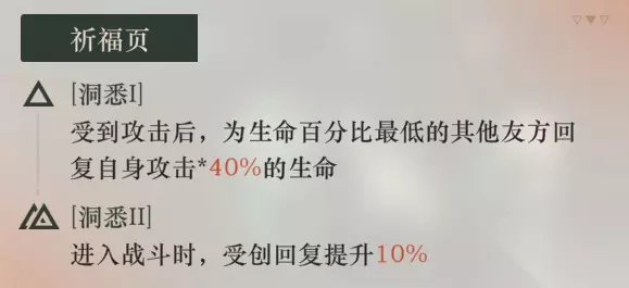 技能组概括:挨打给队友回血的被动,二星时单体易伤的第一神秘术,群体双抗buff及减伤的第二神秘术,两回合减治疗及延迟真伤的大。 如此偏科的面板最终导致:没有配备共鸣,心相的情况下并不能很好的适配其技能组。但这也意味着,如果可以解决双抗低的问题,那铅玻璃在众多四星神秘学家中将会着不错的表现。 2.2.技能介绍2.技能介绍 2.1被动技能:祈福页 被动技能:祈福页