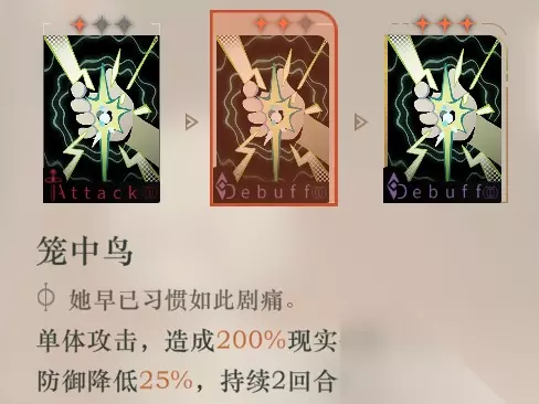 单看两个被动技能:挨揍给队友回血和挨揍后的少量自回血,是相辅相成的优秀被动。 祈福页使铅玻璃具有了神秘学家中少有的不占用行动点数的回复功能。相比起一般的拥有【health】的神秘学家相比,没有稳定群奶和三星【health】“巨额回复”的能力,但是却可以为其他角色提供更多的出牌空间。在对局思路是“活下来磨血”的情况下显然会非常乏力,可如果遇到了“生存压力不大”“超过回合数无法三星”的情况,祈福页的不占用行动点数的回复功能就能体现出优势了。 实战中的表现:由于铅玻璃本身的双抗极低,看齐六星神秘学家的血量,且神秘术Ⅱ是群体buff,所以导致了大概率铅玻璃会优先退场。但作为本身就不用打几张牌的辅助角色来说,本身的功能也就是每回合多一次行动点数,提供一些团队生存能力。所以即使是退场了,在四号位也有人(有一定练度)的情况下并不会导致雪崩。 解决“双抗极低“的对策将在心相与共鸣的相关章节进行讨论。 2.2神秘术Ⅰ:笼中鸟 神秘术Ⅰ:笼中鸟