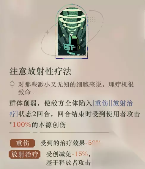 单看神秘术Ⅱ:与【雾行者】的【十分钟后】完全一致,是适用于多种场合的强力buff。相比起【小梅斯梅尔】的【抑制握环】各有优势,前两者相对全面;而相比起【泥鯭的士】的【百合灵水】【十四行诗】的【劝勉·其九】则完全没有可比性,前两者“摆大巴”与后两者“全攻全守”的buff可以相互叠加。 雾行者的相关讨论会在下文关于铅玻璃优势区间中展开。 实战中的表现:可以提供【属性提升】的触发条件,是提供全队生存能力的buff。由于铅玻璃本身的“极低双抗”,所以只有【坚固】能大幅提升其生存能力。在实际对局中并不一定要做到覆盖每个回合,而是可以等其自然合并后,在敌方将要释放【至终的仪式】或者大量二星【attack】时打出,即可规避大量伤害。 2.4至终的仪式:注意放射性疗法 至终的仪式:注意放射性疗法