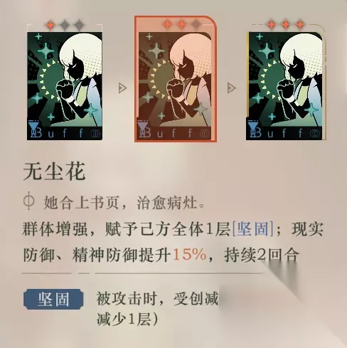 单看神秘术Ⅰ:作为一张单体现实创伤拐,比起一星卡既没有伤害倍率的提升,也有着【现实防御降低】的局限性,只有在面对高【现实防御】敌人会有比【受到伤害提升】有更大收益。在一星卡基本没用的情况下,如果二星笼中鸟是自然合并的,那还是可以启到锦上添花的效果。 实战中的表现:理论可以提高输出也确实是有提升,但是为什么不直接打一张主c的【attack】还能给主c多加一点激情呢?啊……没抽到手里啊……那用【最初的刻度】花25激情洗一波牌吧(如果手牌实在太差)。 2.3神秘术Ⅱ:无尘花 神秘术Ⅱ:无尘花