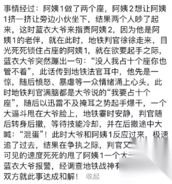 地铁判官是谁 一、梗的意思 9月6日消息,近日,在青岛地铁上,一位老人因座位问题与乘客发生争执。他声称:「我一个人可以占据十个座位。」这句话激怒了旁边的小伙,随即打了老人一个耳光,引发了更大的冲突。 老人报警后,调查发现小伙患有精神疾病。在警方的调解下,双方决定达成和解。此事被网友曝光后,小伙被戏称为「地铁判官」。 二、梗图片