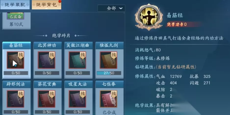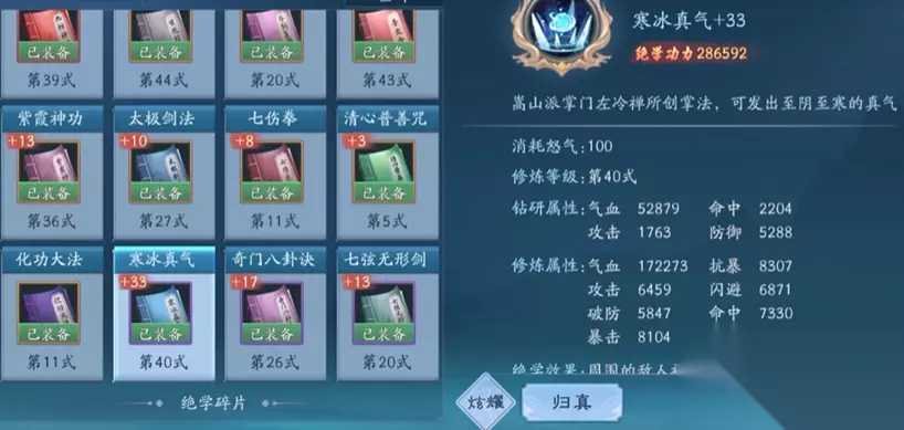 绝学的培养需要合理分配资源,平民玩家不必追求全红色绝学。黄色和紫色绝学在钻研等级提升后也能提供不错的战力加成,比如寒冰真气的碎片容易获取,钻研到5级左右就能看到明显效果。平时多参与世界首领、寻龙探宝等活动,慢慢积累碎片,优先把主绝学等级拉高,再考虑副绝学的搭配。绝学钻研属性会额外赠送战力和属性,性价比很高,建议优先点满。