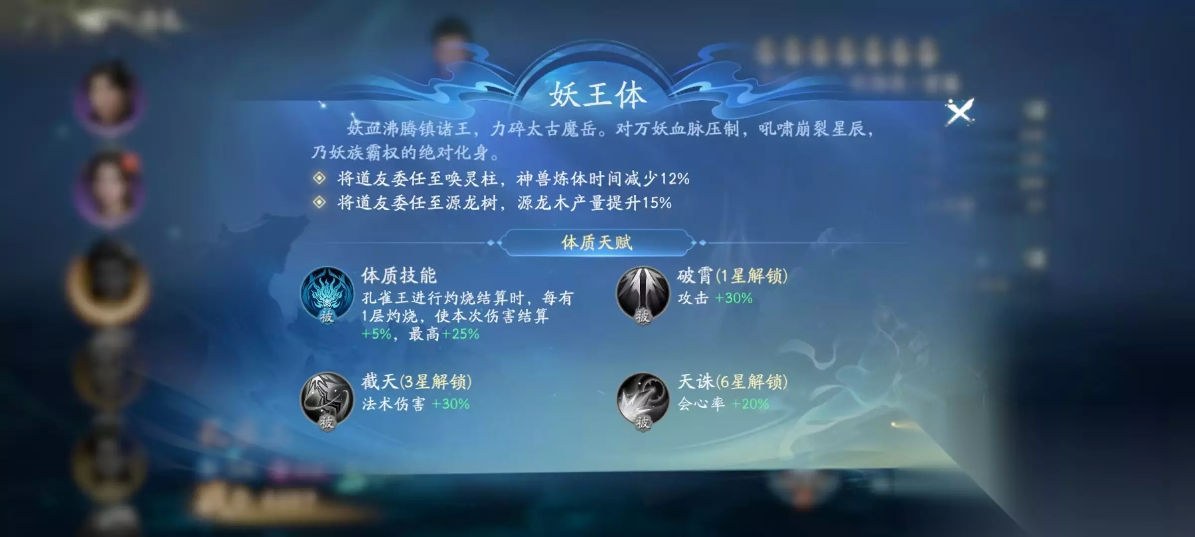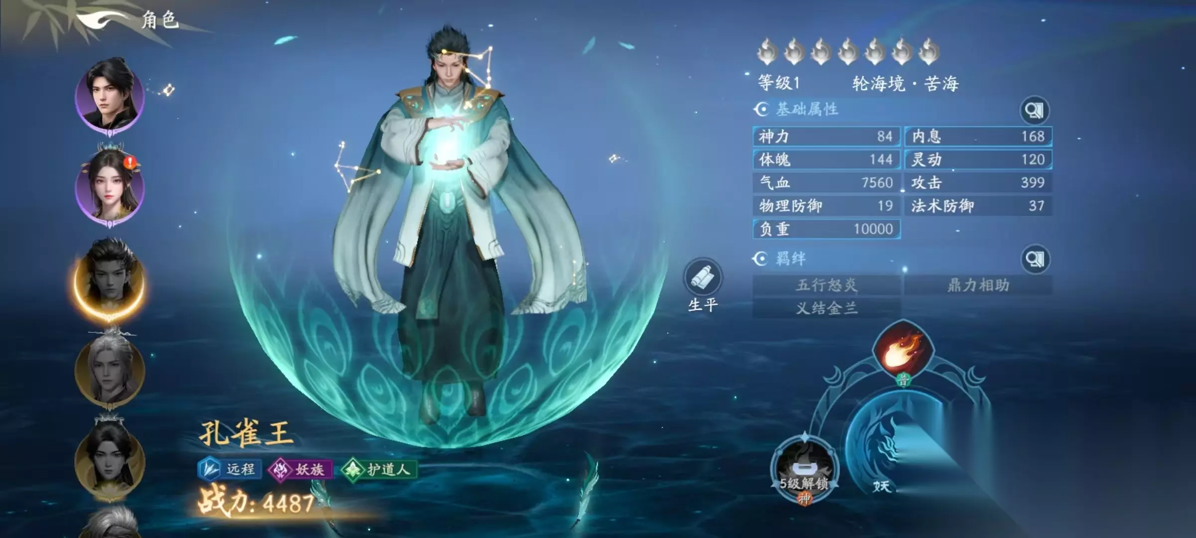 在游戏的定位中,孔雀王是属于远处输出型角色,他是属于妖族,羁绊是护道人。护道人是一个很有用的羁绊效果,当上阵两名护道人时,每存活一名就可以提升全体道友的3%物理防御和3%法术防御。如果上阵三名护道人,则全体第一次血量低于50%的时候,接下来两次攻法伤害可以增加40%。孔雀王是属于妖王体。特点是委任到唤灵柱时,神兽炼体时间可以减少12%。委任到源龙树时,源龙木产量提升15%。