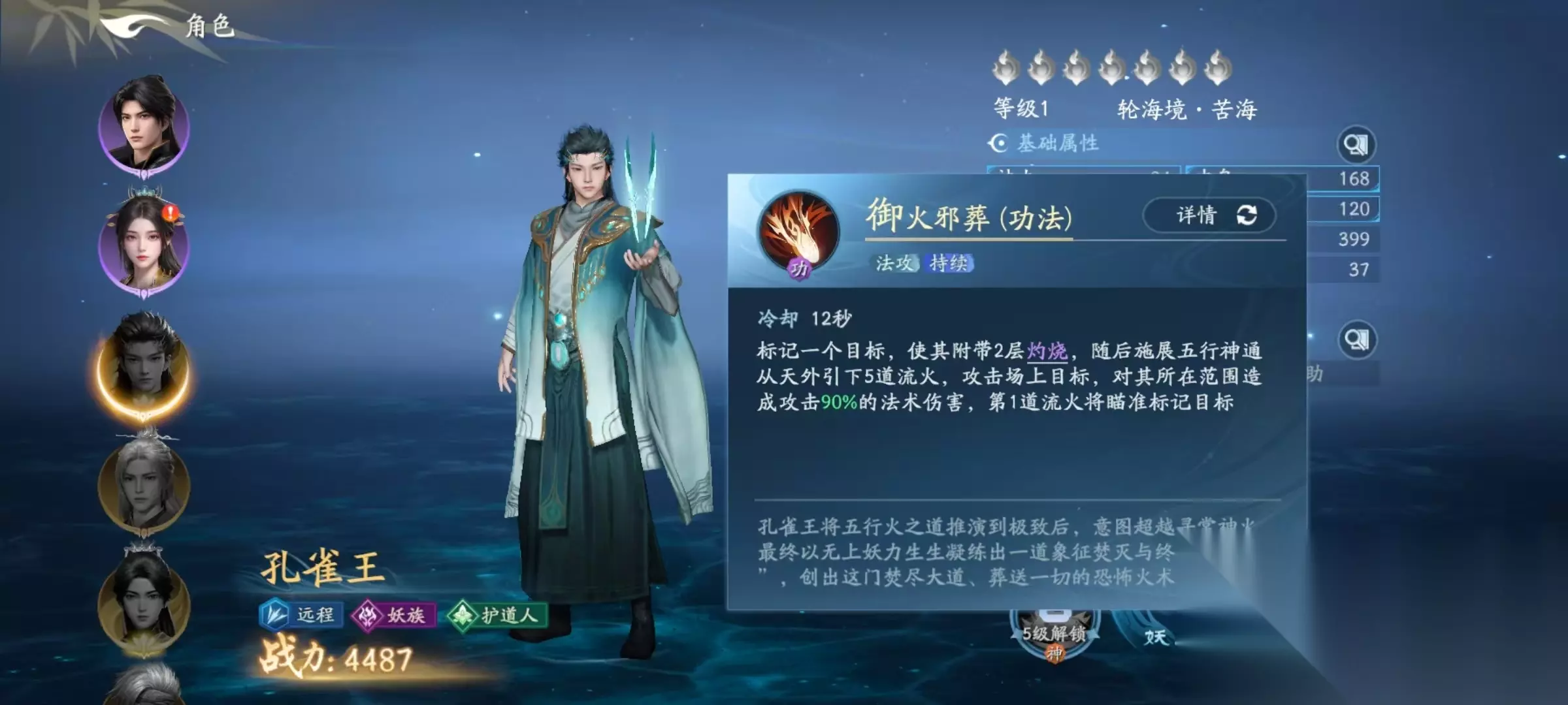 妖王体还有一些独特的体质天赋,孔雀王进行灼烧结算时,每带有一层灼烧,本次伤害结算就能增加5%。最高能达到25%的加成。之后升到一星时,可以提升30%攻击,升到三星时增加30%伤害,升到六星时增加20%的会心率,所以这个体质在后期输出方面还是比较有潜力的。在技能方面,普攻可以对小范围内的目标造成法术伤害。功法的效果是标记一个目标,使其附带2层灼烧效果,随后打出5道流火,攻击场上的单位,对所在范围造成法术伤害,其中第一道流火直接瞄准标记目标打出输出。神通技能是对范围内的目标造成高额法术伤害,并将目标身上的灼烧层数立即结算。