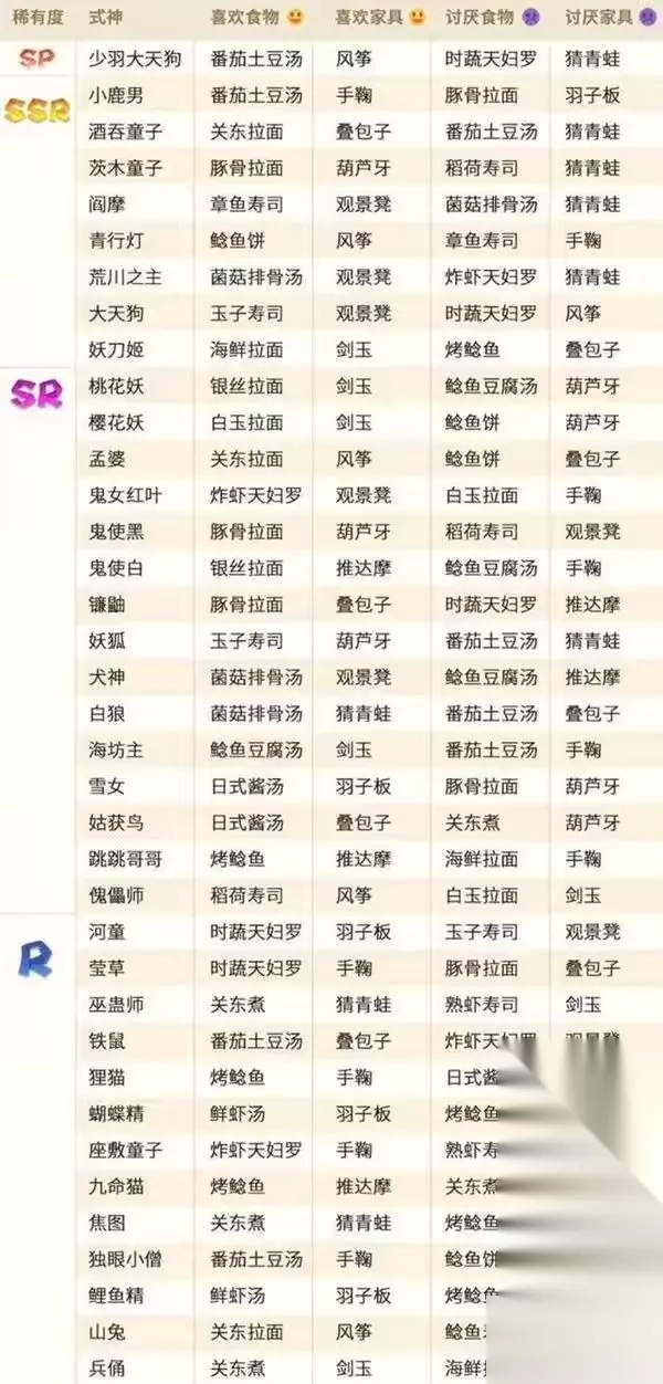 阴阳师妖怪屋不同的式神喜欢的东西是不一样的,玩家可以了解式神的喜好,然后找到该式神喜欢的东西,通过这种方法能提升式神的好感度,下面给大家带来的就是式神的喜好列表,帮助大家了解式神喜欢和厌恶的食物以及玩具。