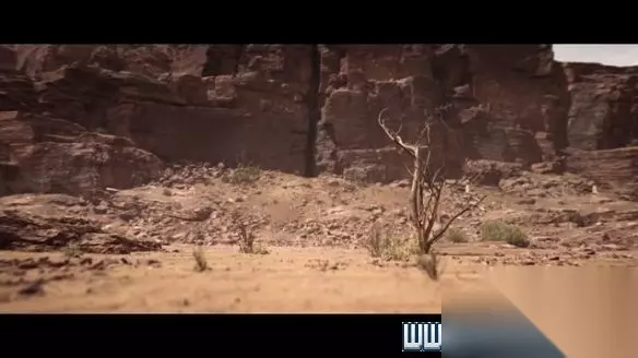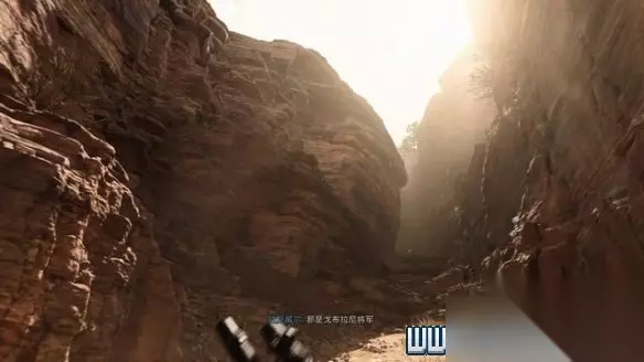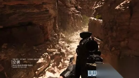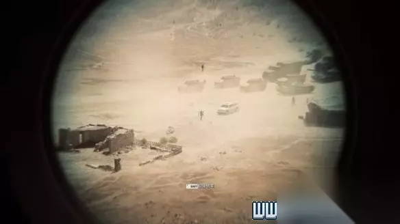 在悬崖边按E通过瞄准镜查看,shift键可以切换倍率,沙漠中显然有重要人物在活动。
