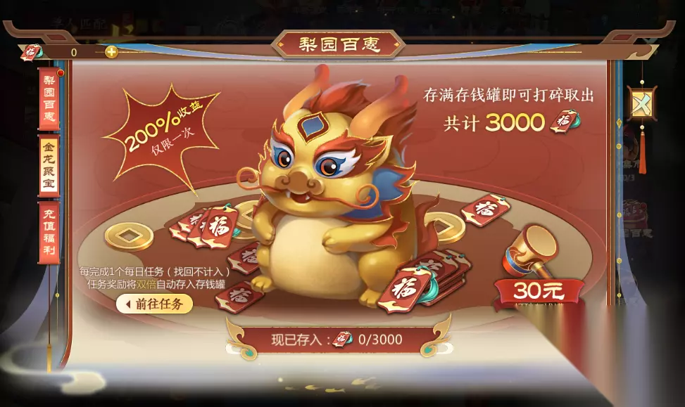 金龙聚宝也是拿下大量鸿福签的重要途径之一。仙术师们在福满佳年活动中完成每日任务所得鸿福签将双倍自动存入金龙聚宝,存满即可打碎取出,共计3000鸿福签,仅此一次哦~ 充值这三大礼包,鸿福签嘎嘎多!想要攒下大量鸿福签换好礼,这几个礼包可不要错过哦~ 3进阶好礼 推荐购买:超值必买礼包一+超值必买礼包二+188元国粹京剧礼包+68元鸿福守护礼 可获鸿福签:3199+5248+4299+3999+900=17645