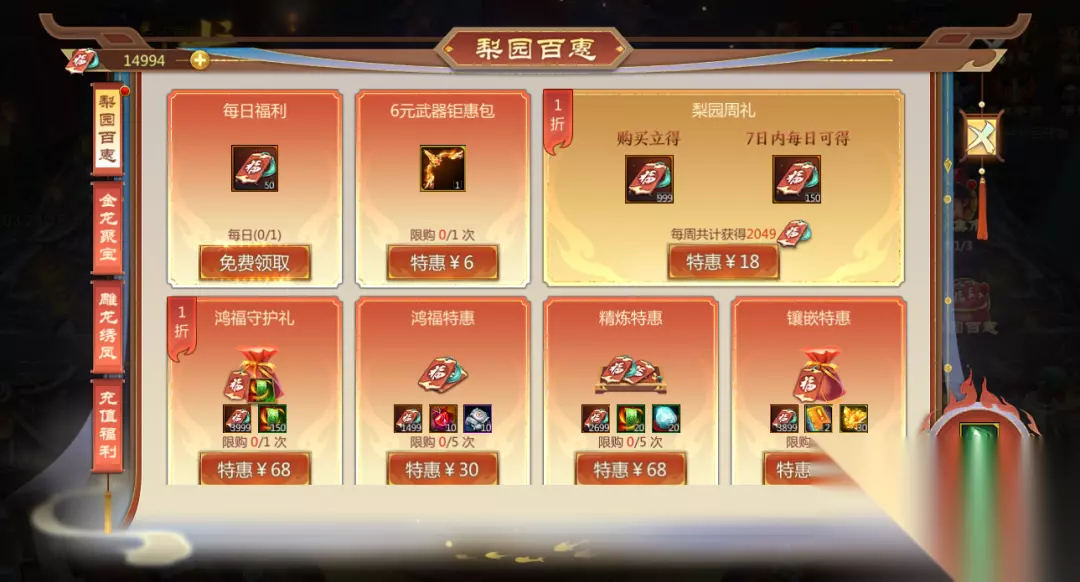 这样一套小连招下来,购买【齐乐龙龙礼包】可不是物超所值嘛,还不冲冲冲~ 2超值必买礼包二 推荐购买:6元武器钜惠包+18元梨园周礼+30元金龙聚宝 可获鸿福签:199+999+150*7+3000=5248 要说本次还有什么礼包是不能错过的话,那么6元武器钜惠包、18元的梨园周礼以及30元金龙聚宝肯定得提一嘴。 6元武器钜惠包 仙术师仅需花费六元即可任选四章武器,并获得暗金+13卷轴(武)、199鸿福签、谋定天下成就卷轴自选等多重好礼~