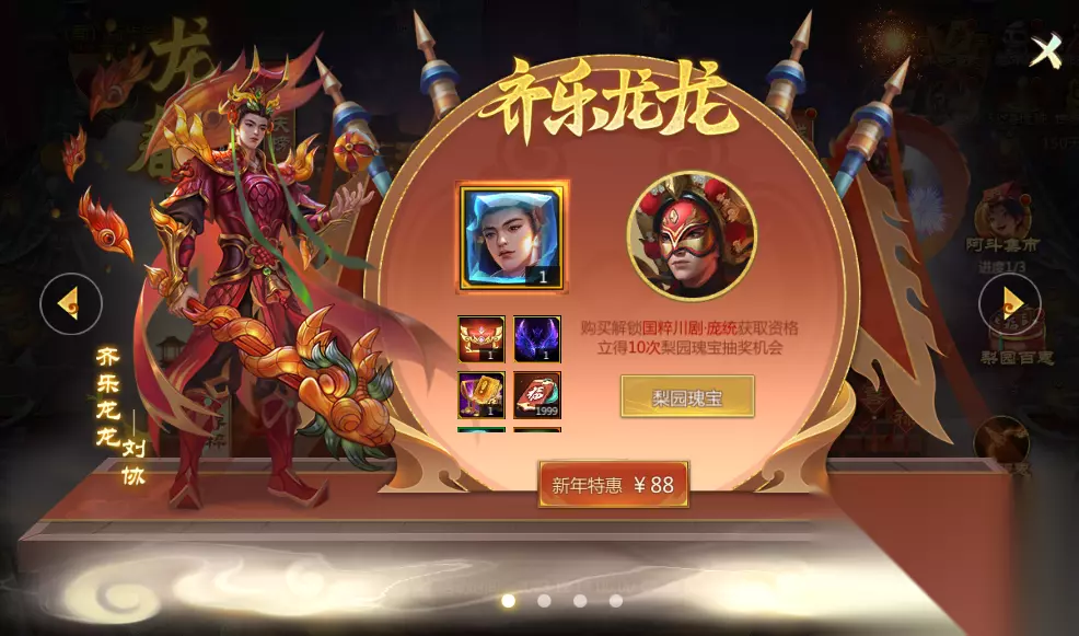 齐乐龙龙(称号) 此外,还有龙吟春晓武器甄选、龙吟春晓镶嵌卡册等更多好礼哦~ 除了礼包本身外,获取【齐乐龙龙】还可解锁梨园瑰宝活动内梨园额外奖励——国粹川剧·庞统的获取资格。同时,可立得10次梨园瑰宝抽奖机会。