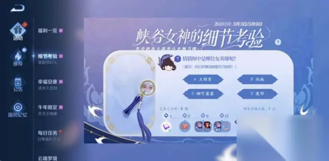 王者是一款经典的moba类手游,王者荣耀里面的活动和玩法很多,很多活动都是比较益智的,最近有一些玩家在进行峡谷女神的细节考验活动,这个获得需要完成选择题,然后才能获得奖励,有一些玩家想知道值167块钱的女英雄是谁,这个问题的答案很多玩家不知道,那么下面就带给大家王者荣耀值167块钱的女英雄答案介绍。