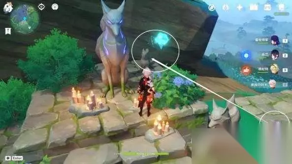 依次选择「鸣神赦使」、「白辰血脉」、「油豆腐,速速来」,对话结束取得「镇物」 使用「留念镜」调查天狐雕像旁的「地狐」小像,出现一个仙灵