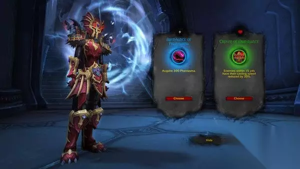 4.难度不影响流程, 只增加通关难度 无论你选择什么难度, 你获得心能的稀有度, 概率 都是一样的. 难度会提升敌人的血量和伤害. 会增加覆盖全程的词缀. 会在关卡中安排高危怪或者高危怪组合. 当我们选择了一个难度进入场景之后, 右上方显示大秘境进度的地方, 会变成托加斯特的界面. 上面会显示我们现在处于第几层, 我们还剩几次可以死的次数(坟墓标志), 我们还有多少幻灭心能(蓝色标志). 同时在Debuff区域会有我们当前受到的难度词缀. 于此同时, 我们的面前会有一个可以拾取的心能. 心能就是各种各样强大或者弱爆的能力. 有被动的,有主动的, 有的还会强化你的技能. 值得注意的是很多不怎么玩Rogue like游戏的玩家都会被 稀有度 所误导. 包括在这个9.0爬塔中也是一样的. 我们选择心能的标准不是心能的稀有度, 而是这个心能好不好用, 或者他和别的心能搭配在一起有没有奇效. 因此不要看到稀有度高的就去选, 稀有度仅决定了这个心能出现的概率, 和强度无关.