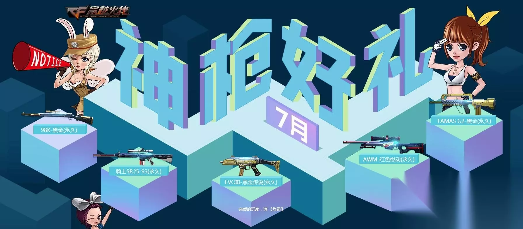 活动时间:2020.7.15-2020.7.31 活动内容: 神秘宝箱免费领取 活动期间,玩家登录并游戏一局即可随机抽取下方一件道具!