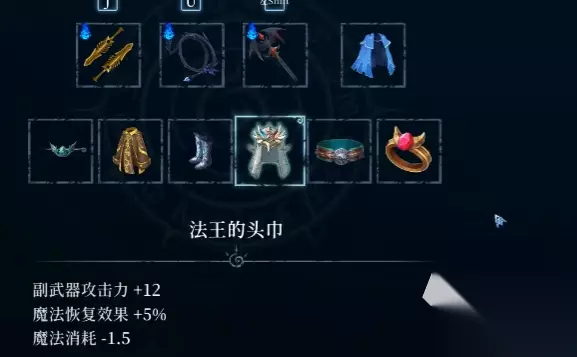 玩家们如果走的是法师流派,那么法王的头巾这件装备可是相当需要的,这件饰品的属性是副武器攻击力+12,魔法恢复效果+5%,魔法消耗-1.5。可以说是大大增加了魔法的续航能力,这件装备的获取地点在巨人的陨落地过了宫殿的下方有个隐藏点,饰品就在里面。