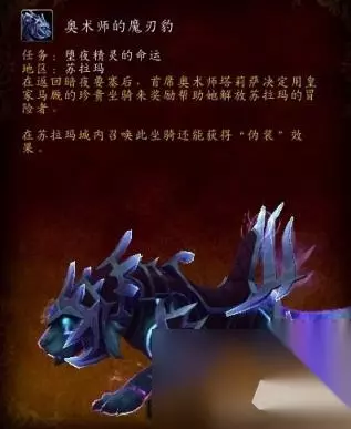 在击败了古尔丹完成了“!暗夜要塞:暗影议会首领”任务后,会再获得几个任务。其中包含一个任务“!堕夜精灵的命运”,这个任务完成后才会真正奖励奥术师的魔刃豹! 最关键的这一步堕夜精灵的命运,因为测试服古尔丹比较难,数据挖掘也没挖出。所以暂时没人知道这个任务要求!