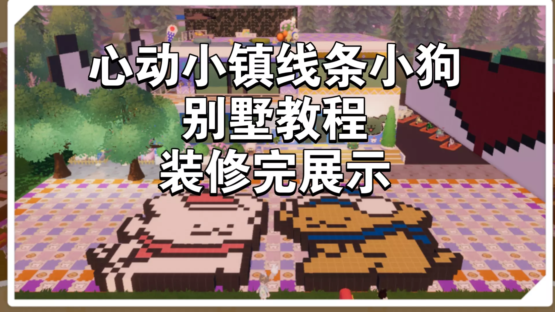 这是模拟经营游戏《心动小镇》里线条小狗系列别墅教程的最后部分,展示了别墅搭建过程中的不同环节,包括木质支撑柱摆放、外墙装饰、地板铺设等,还提示教程为三倍速可自行放慢,颜色可按喜好调整。
