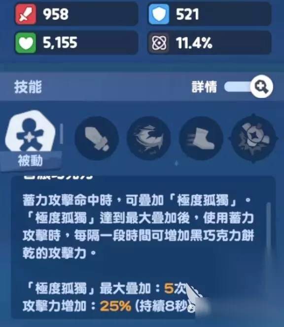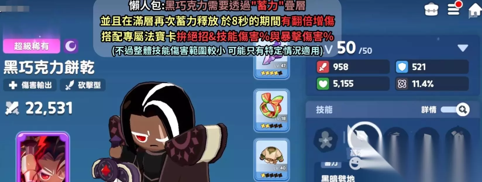 黑巧克力饼干的被动技能极度孤独需通过蓄力攻击命中敌人叠加层数,每层叠加后满5层即可在8秒内实现攻击力翻倍,但需持续蓄力来维持层数,所以就让他有一定的门槛。而技能倍率是普通攻击为基础倍率无加成,蓄力攻击则有1.2倍伤害且命中叠加一层被动。蓄力虽然需要时间,但爆发伤害很高,也是我们使用黑巧克力打出爆发的关键。黑暗剑击(小招)基础7.5倍伤害,满层被动时增至14倍+,黑暗袭击(必杀)能打到20倍+伤害,冷却30秒,满星穿透50%防御。而且蓄力条读满瞬间立即松手,会比读条结束自动释放快一点点,估计也就零点几秒左右,这零点几秒足够你在BOSS抬手前打出第一刀,既叠层又躲技能,而且黑暗剑击的闪电伤害会触发后悔卡的额外暴伤,所以小招后立刻接普攻再蓄力,能把两层增益时间完全利用。