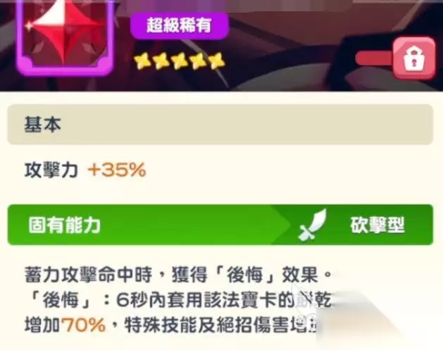 黑巧克力饼干的星级提升对战里提升非常高,二星解锁初始被动满层,进场即可触发8秒攻击力翻倍,而四星强化小招附加20%攻击力闪电伤害,满星让必杀技穿透50%防御力。法宝卡核心是后悔,蓄力命中后6秒内暴伤+70%且技能伤害+70%,叠加后伤害直接翻三倍,输出能力可以说是非常不错的。