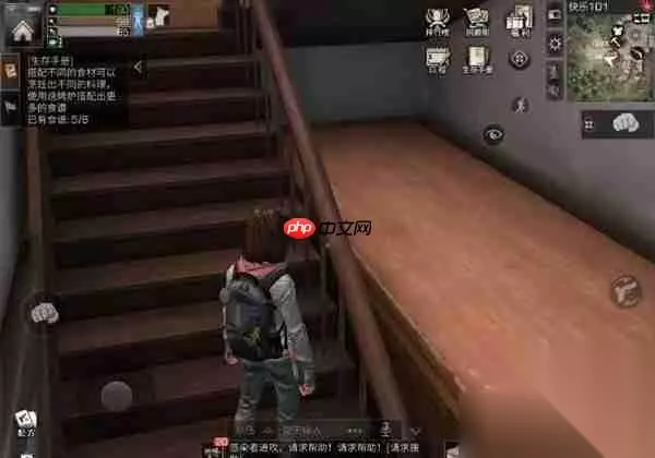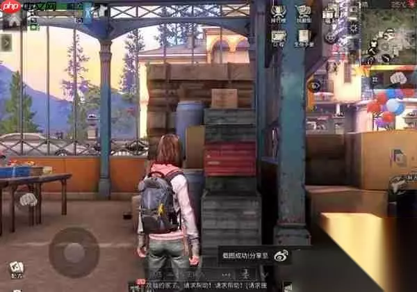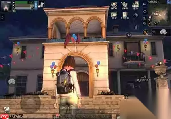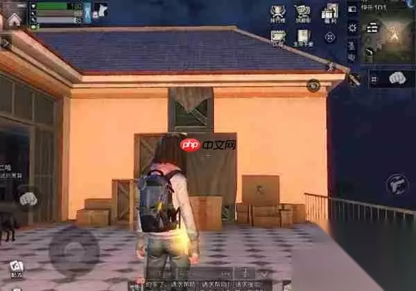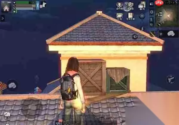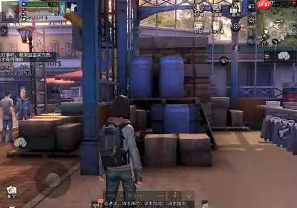 4、登上楼顶后继续前进,找到如图所示的位置,探索点就在两个箱子上方,第一个探索点完成;