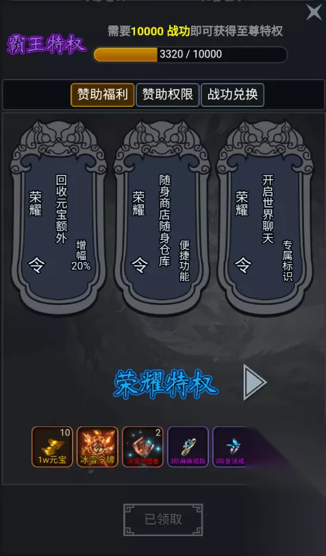 特权分为荣耀特权,霸王特权,至尊特权,主宰特权。提升赞助等级可以获得赞助权限。 ◆荣耀特权:回收元宝额外增加20%,随身商店随身仓库开启,开启世界聊天功能,打怪爆率增加5%,领取荣耀礼包,杀怪经验提高5%,额外增加仓库页1页,云游商人免费贿赂次数3次,战功兑换次数增加2次,血量加300,法力加300,攻击防御加5。 ◆霸王特权:元宝回收额外增幅50%,BOSS之家开启,打怪爆率提升10%,领取霸王礼包,杀怪经验提高10%,战功兑换消耗折扣9折,战功兑换次数增加10次,挖矿加成5%,攻击防御加10。 ◆至尊特权:攻防双提升66点,全元素抗性增幅5%,打怪爆率提升15%,领取至尊礼包,杀怪经验提高15%,云游商人免费贿赂次数5次,战功兑换消耗折扣8折,战功兑换次数增加20次,挖矿加成10%,攻击防御加66。 ◆主宰特权:PK击杀爆率增幅10%,PK死亡防爆率增幅10%,对BOSS伤害增幅20%,打怪爆率增加20%,领取主宰礼包,杀怪经验提高20%,战功兑换消耗折扣7折,挖矿加成20%,全元素抗性增幅10%。 ◆荣耀礼包:1W元宝*10,冰雪令牌,冰雪地图券*2,3阶麻痹戒指,3阶复活戒指。转生礼包(1转材料,2转材料,经验券)。 ◆霸王礼包:1W元宝*20,钻石斗笠,钻石护盾,转生礼包(3转材料,经验券),白虎魄珠*450,圣魔保险888点。 ◆至尊礼包:1W元宝*70,转生礼包(4转材料,经验券),青龙琥珀*850,白虎魄珠*850,神魔结晶*20,神魔保险3888点。 ◆主宰礼包:1W元宝*900,转生礼包(5转材料,6转材料),创造宝石*10,五彩石*30,主宰魂环玩家可以使用赞助令牌,元宝,灵符兑换战功。