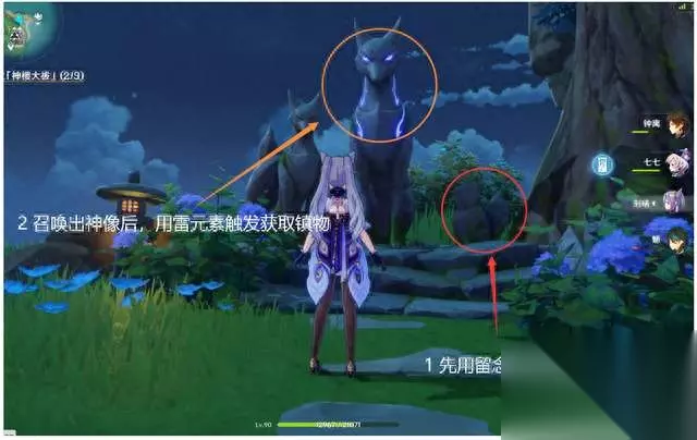 该任务不能单独领取的,只有按照顺序来做(从“绀田事话”开始做) 这是第五部分《神里屋敷》 (1)传送到神里屋敷地图区域,来到箭头位置,用留念镜照地狐召唤出狐雕像,然后用雷元素触发获取振物,
