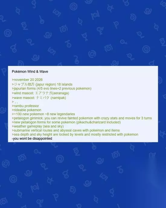 随着2月27日宝可梦诞生30周年纪念日的临近,关于第十世代(Gen 10)新作的爆料正席卷全球网络。 根据这份最新的爆料,宝可梦第十世代的两款作品暂定名为《宝可梦:风》(Pokémon Winds)与《宝可梦:浪》(Pokémon Waves)。泄露信息指出,这两款新作预计将于2026年11月20日正式发售,这完全符合宝可梦主系列作品惯常的“11月发售”节奏。