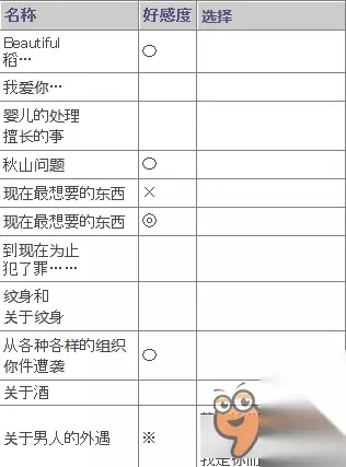 同步方法 邮件来 此的印章(右下)发送 剧院前广场上沙希和对话“褶��”或“卡拉ok” 选择卡拉ok 在卡拉ok唱歌,仍需留心A Butterfly 在卡拉ok今天钻石/唱歌/ hands听完 对话对好感度的影响与选择