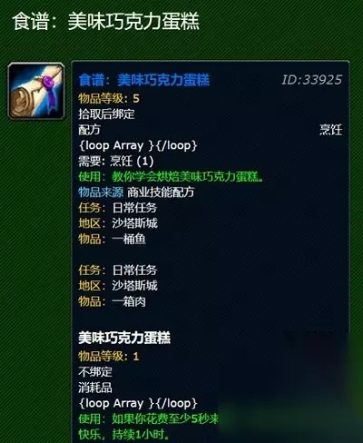 wow美味巧克力蛋糕说明 物品等级: 5 拾取后绑定 配方烹饪 {loop Array }{/loop} 需要: 烹饪 (1) 使用:教你学会烘焙美味巧克力蛋糕。 物品来源 商业技能配方 任务:日常任务 地区:沙塔斯城 物品:一桶鱼 任务:日常任务 地区:沙塔斯城 物品:一箱肉 美味巧克力蛋糕ID:33924 物品等级: 1 不绑定 消耗品食物和饮料 {loop Array }{/loop} 使用:如果你花费至少5秒来进食,你将会变得非常快乐,持续1小时。 以上是小编为各位带来的wow美味巧克力蛋糕材料去哪购买的内容,更多相关资讯攻略、游戏资源,请持续关注233乐园。