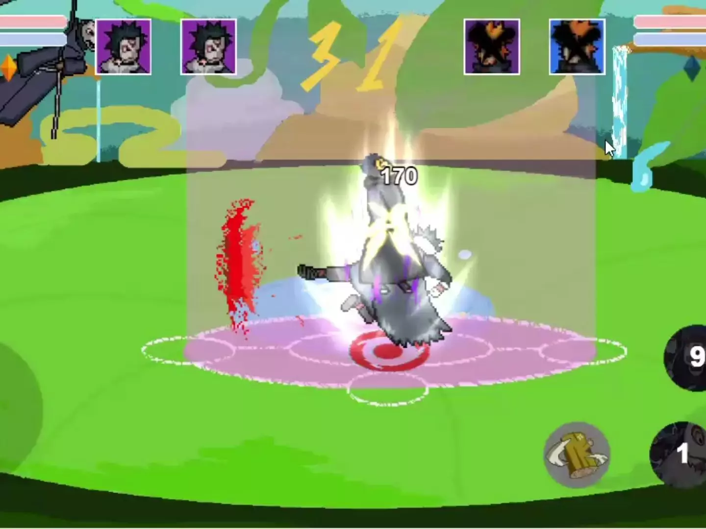 这是《像素火影》的联机版本1.0的对战展示,画面呈现了像素风格的火影角色联机对战场景,能看到角色释放技能、造成伤害的战斗过程,展现了该联机版本的对战玩法。