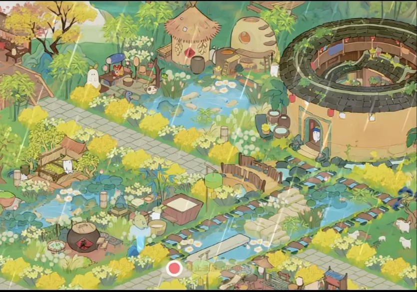 这是游戏《桃源深处有人家》的场景分享,展示了桃源里山水相依、繁花满树的清幽景致,还有游戏角色在其中漫步、闲坐,呈现出与好友作伴的惬意桃源生活。